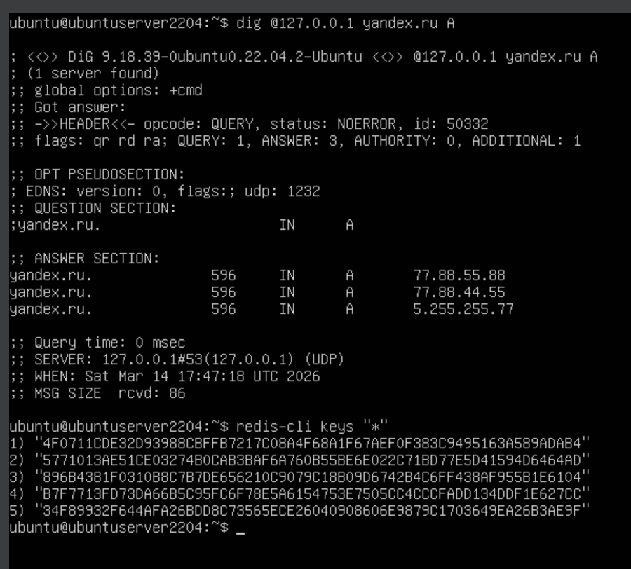 При поступлении запроса Unbound сначала проверяет собственный in-memory кэш. Если записи нет — обращается к Redis. Если нет и в Redis — уходит за ответом к авторитетному серверу, после чего сохраняет результат в оба кэша.