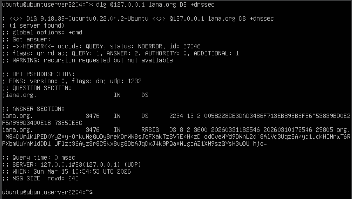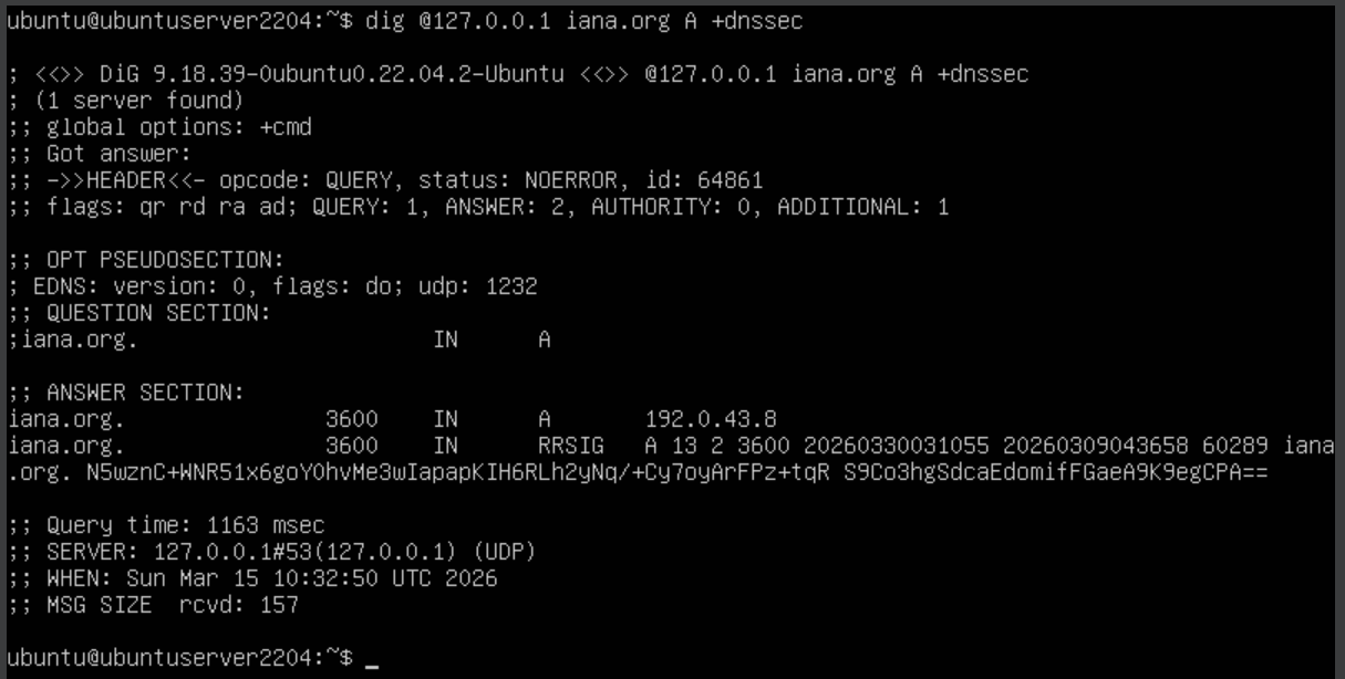 В секции ANSWER вместе с A-записью присутствует RRSIG — цифровая подпись набора. Флаг ad (Authenticated Data) в заголовке ответа подтверждает, что Unbound успешно верифицировал цепочку доверия.
