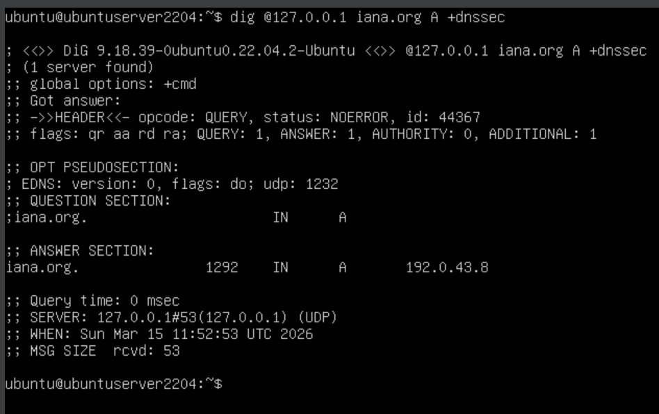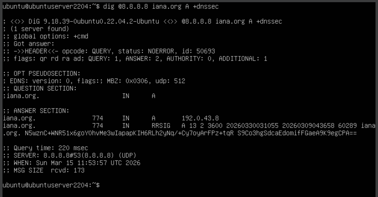 ad присутствует — DNSSEC-цепочка проверенаRRSIG присутствуют — данные подписаны ZSK зоны iana.orgQuery time — десятки миллисекунд (сетевой запрос)