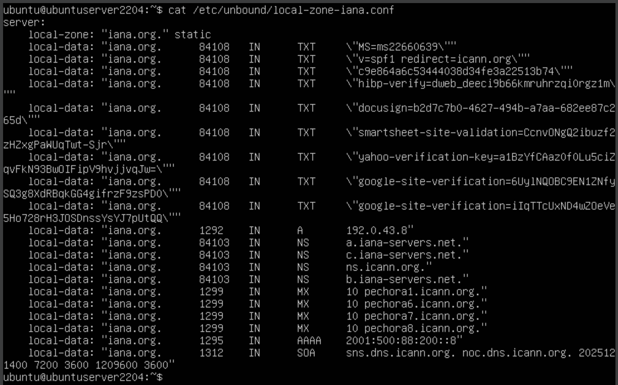 Чтобы собрать данные зоны через резолвер, нужно временно отключить local-zone — иначе Unbound будет отвечать из локальной базы и не пойдёт к авторитетным серверам. После сбора данных и их кэширования восстанавливаем local-zone с реальными значениями.